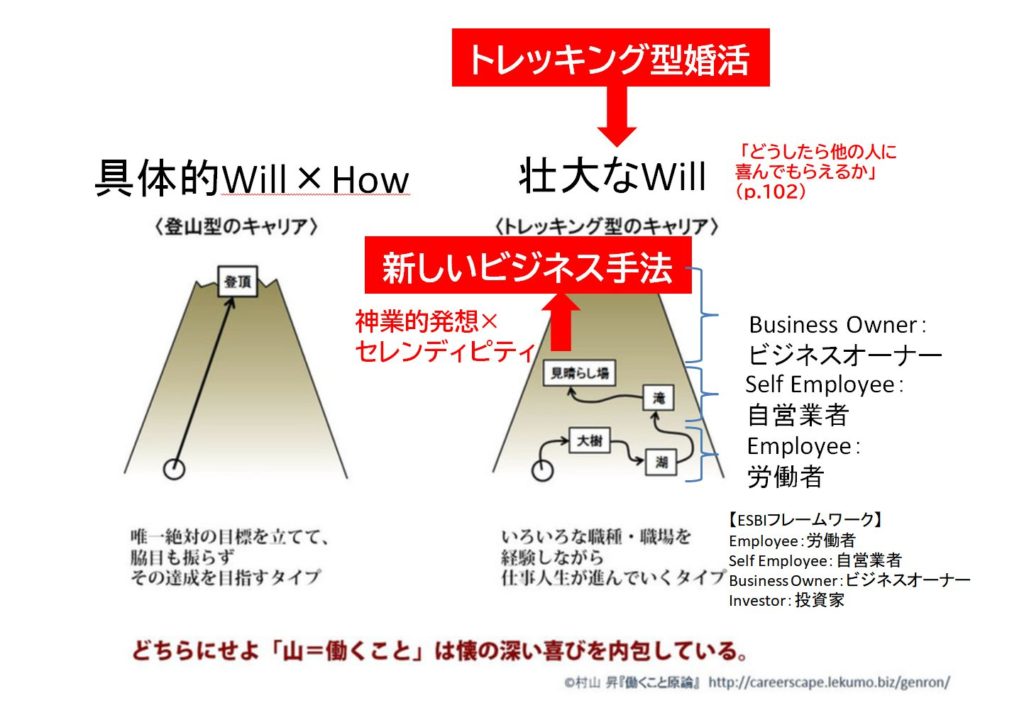 【図:『働くこと原論』を活用したキャリア形成の2つのアプローチとトレッキング型婚活(福崎ことみ作成)】